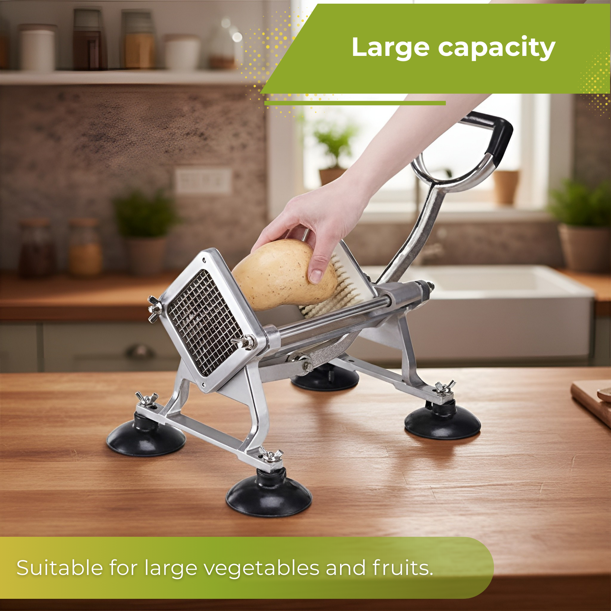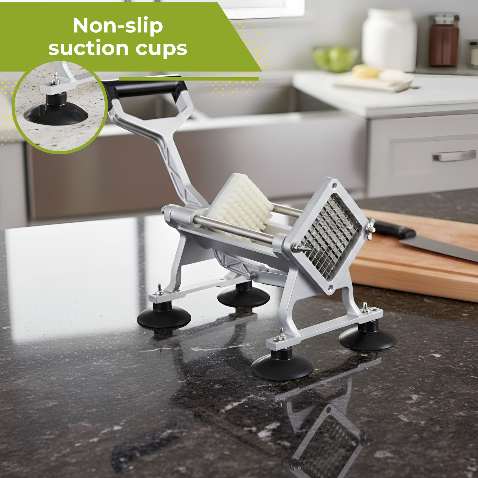De stevige zuignapvoetjes houden de groentesnijder vast op je werkblad, zodat je veilig en nauwkeurig kunt werken zonder verschuiven.
